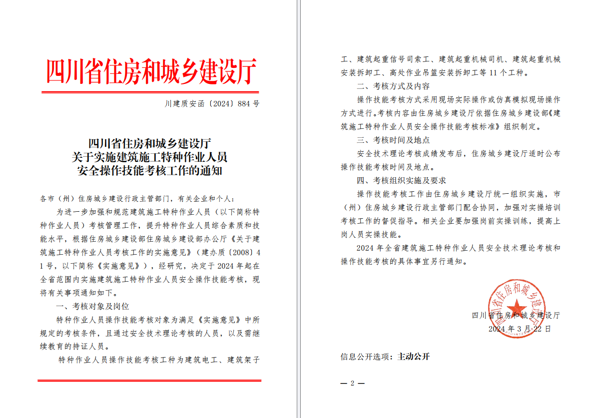 (二)《四川省住房和城乡建设厅关于实施建筑施工特种作业人员安全操作技能考核工作的通知》(川建质安函〔2024〕884号)